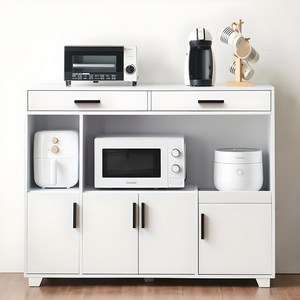화이트 컬러와 4단 구조로 깔끔하며 넓은 상판과 서랍, 선반으로 전자레인지, 밥솥 등 주방용품을 효율적으로 수납할 수 있는 1200mm 와이드 수납장.