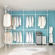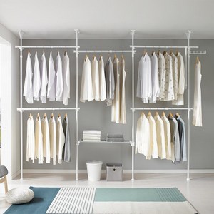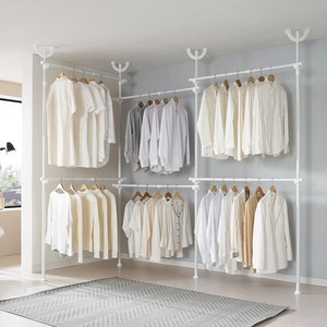 튼튼한 철제 프레임과 선반 구조로 다양한 의류와 소품을 효율적으로 정리할 수 있으며, 화이트 색상으로 깔끔한 인테리어 연출이 가능한 드레스룸 행거입니다.