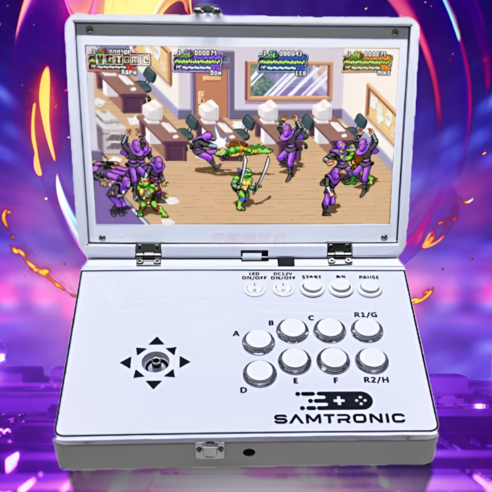 접이식 구조로 휴대가 편리하며, 고전게임을 포함한 다양한 멀티플레이 기능을 지원하는 레트로 미니 오락실 게임기, 집이나 외출 시 어디서나 즐길 수 있음.
