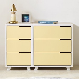 컴팩트한 사이즈로 원룸이나 안방에 적합하며, 밝은 옐로우 컬러와 다용도 수납 기능을 갖춘 실용적인 서랍장 세트.