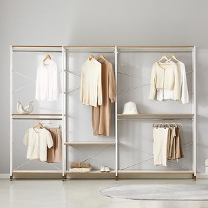 화이트 프레임의 와이드 시스템 행거로 조립식 구조를 갖추어 드레스룸에서 옷과 소품을 효율적으로 정리할 수 있어요.