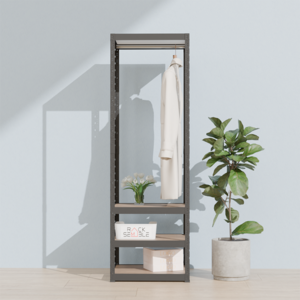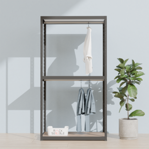 월넛 컬러와 블랙 프레임의 모던한 디자인으로, 넓은 와이드 구조와 튼튼한 철제로 다양한 옷과 소품을 효율적으로 수납할 수 있는 조립식 드레스룸 행거입니다.
