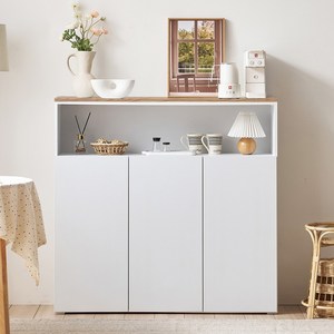 상부 오픈형 구조로 활용도가 높고 오크화이트 색감이 따뜻한 분위기를 주는 슬림형 다용도 수납장이다.