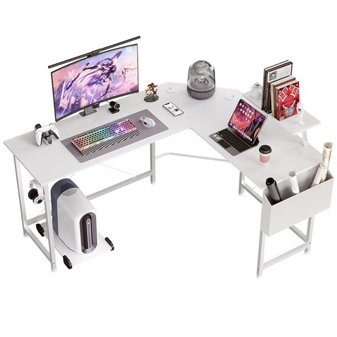L자형 코너 구조와 탄소 섬유 상판으로 내구성이 뛰어나며, 좌측·우측 선택이 가능하고 검정색과 흰색 옵션으로 게이밍과 학습 환경에 모두 적합한 컴퓨터 책상입니다.