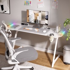 Z형 구조의 RGB LED 게이밍 책상으로, 컵홀더와 헤드셋 거치대가 포함되어 있으며 1200~1600mm 크기 옵션을 제공하고 화이트 색상으로 깔끔한 디자인을 갖춘 컴퓨터 책상입니다.