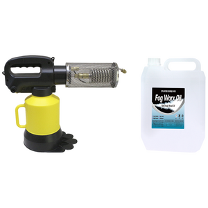 휴대용 터보 연막 소독기와 포그웍스오일 4L 세트로 구성된 제품으로, 모기와 해충을 효과적으로 살충하며 소독과 방역 작업에도 활용할 수 있는 연막 분사 장비.