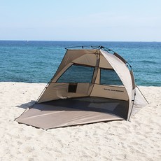3~4인용 공간을 제공하며 원터치 방식으로 빠르게 설치할 수 있는 비치쉘터 텐트로, 탄 색상과 통풍 구조로 해변이나 야외 활동에서 편리하게 사용할 수 있는 제품입니다.