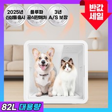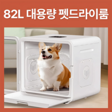 82L 초대형 용량으로 대형 반려동물도 편리하게 사용할 수 있는 드라이룸으로, 강력한 바람과 온도 조절 기능으로 빠르고 안전하게 털을 건조할 수 있음.