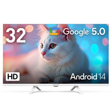 32인치 크기의 프리즘코리아 HD 구글 5.0 AI 스마트 TV로 구글 기능을 활용한 다양한 콘텐츠 이용이 가능하며, 화이트 색상과 스탠드형 디자인으로 깔끔하게 설치할 수 있다.
