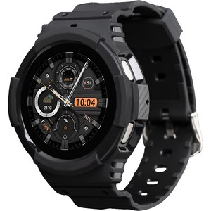 갤럭시워치와 호환되는 블랙 컬러 스포츠 스트랩으로, 일체형 디자인과 사이드 풀커버 구조로 시계를 보호하면서 활동적인 착용감을 제공하는 액세서리입니다.