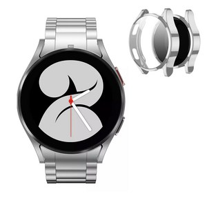 갤럭시워치와 호환되는 실버 색상의 스탠다드 메탈 스트랩과 유광 케이스 세트로, 시계를 보호하면서 세련된 외관과 편안한 착용감을 제공하는 액세서리입니다.