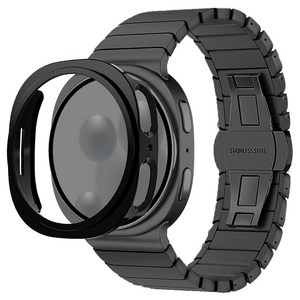 갤럭시워치와 호환되는 블랙 컬러의 일체형 링크 브레이슬릿과 범퍼 케이스 세트로, 시계를 안전하게 보호하면서 세련된 디자인으로 착용감을 높여주는 액세서리입니다.