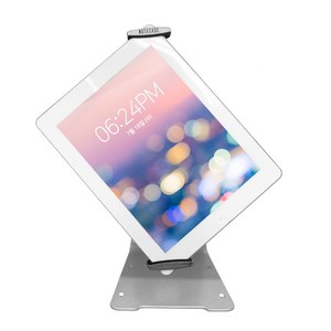 태블릿을 안전하게 고정할 수 있는 잠금장치 거치대로, 안정적인 지지와 편리한 각도 조절이 가능하며, 실버 색상으로 깔끔하게 설치할 수 있는 제품.