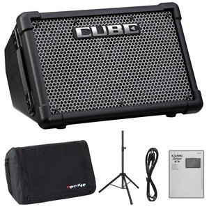 휴대용 앰프 큐브스트리트 EX와 전용 가방, 스탠드를 포함한 풀패키지로, 야외 공연이나 이동 연주에 최적화된 블랙 디자인의 이동형 앰프 세트.