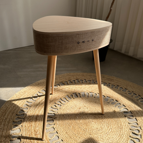 무선충전 기능이 내장된 블루투스 스피커 테이블로, 스마트폰 충전과 고음질 음악 재생이 동시에 가능하며 실내 인테리어와 어울리는 세련된 디자인을 갖추고 있습니다.