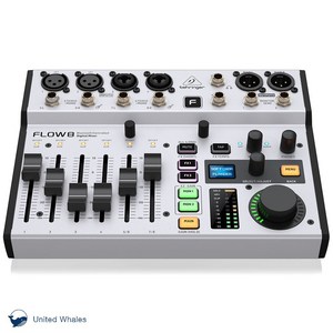 - Behringer FLOW 8은 8채널 입력을 지원하는 디지털 믹서며 블루투스 스트리밍과 앱을 통한 원격 제어 기능이 탑재되어 있습니다.