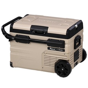 코오롱 알피쿨 X35는 샌드베이지 색상의 이동식 냉장고로, 캠핑, 차량, 낚시, 화물 등 다양한 야외 활동에서 사용할 수 있으며 블루투스 기능으로 편리하게 온도 조절이 가능하다.