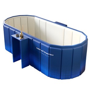 블루 색상의 접이식 성인용 간이 욕조로, 와이드 설계로 편안한 반신욕이 가능하며, 울트라 경량 구조로 집에서도 간편하게 설치하고 보관할 수 있는 제품입니다.