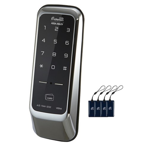 게이트맨 와이트 VIENA 도어록 + 카드키 4p 세트는 현관문에 직접 설치해 쓰는 디지털 도어락으로 카드키 4개가 포함돼 출입 관리가 편하고 기본적인 보안 기능을 갖춘 제품입니다.