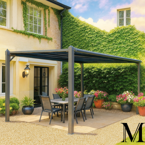 알루미늄 프레임과 렉산 지붕으로 제작되어 폭 3m의 넓은 공간을 커버할 수 있으며, 독립형 구조와 조립식 설계로 옥상이나 정원 등 다양한 야외 공간에 설치 가능한 파고라 제품입니다.