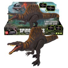 스피노사우루스 21.5cm 크기 아동용 장난감 공룡 피규어로, 몸체에 라이트가 탑재되어 빛이 나고 걸을 때 모션이 작동하며 사운드 효과로 공룡 소리를 재생하는 기능을 갖춘 완구입니다, 실제 공룡 모습을 모티브로 한 디자인으로 아이들이 놀이 중 상상력을 자극시키는 제품입니다