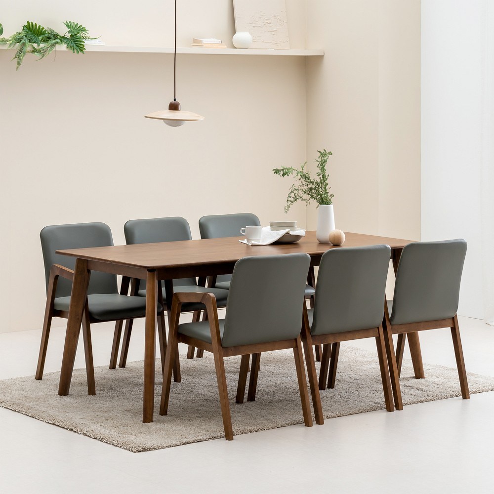 웰퍼니쳐 클로이 식탁 세트는 고무나무 원목으로 제작된 6인용 식탁과 의자 6개로 구성되어 있습니다. 월넛 브라운 색상의 클래식한 디자인과 내구성 있는 소재로 가정이나 모임 공간에 적합합니다. 방문설치로 편리함을 제공합니다.
